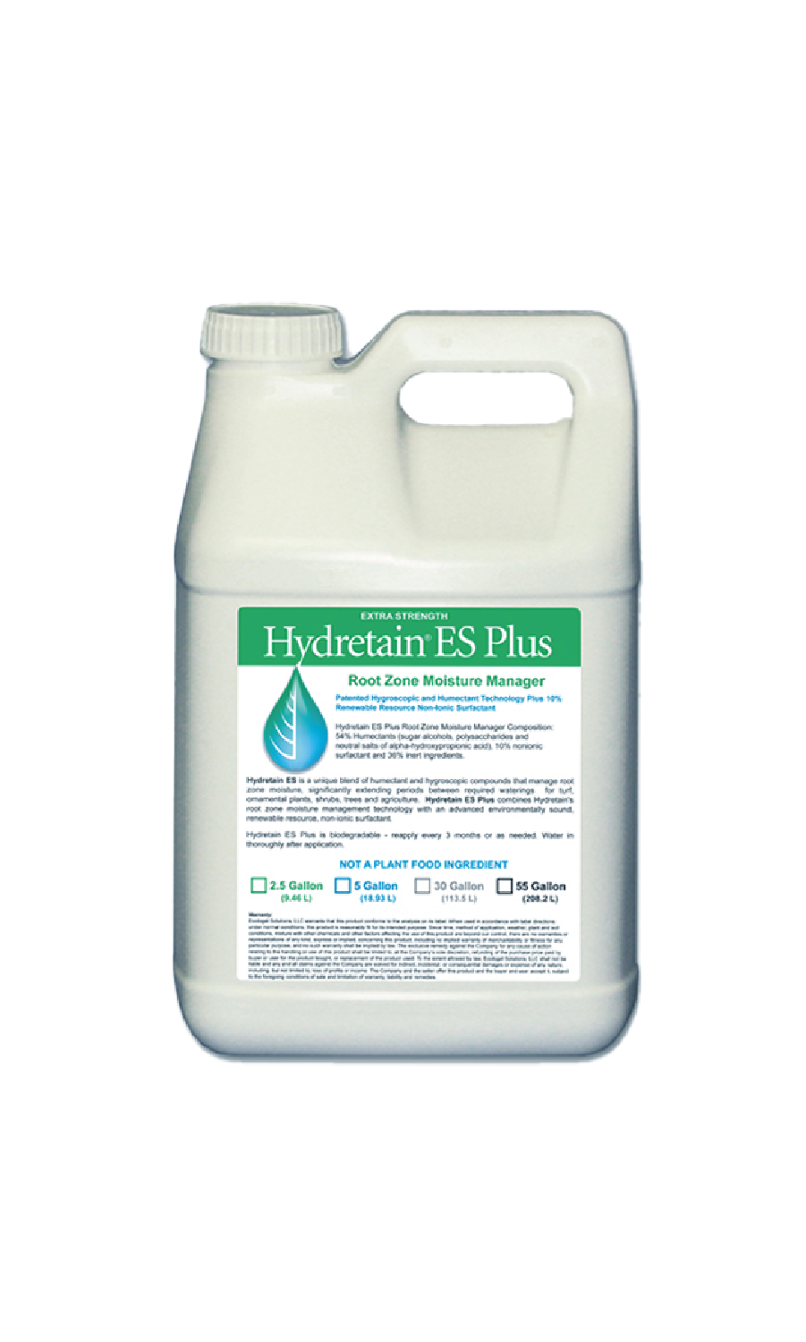 Hydretain ES Plus es una mezcla única de compuestos humectantes e higroscópicos diseñados para el control de la humedad en las raíces, aumentando significativamente el tiempo entre el riego necesario para los pastos, plantas ornamentales, arbustos, árboles y agricultura.